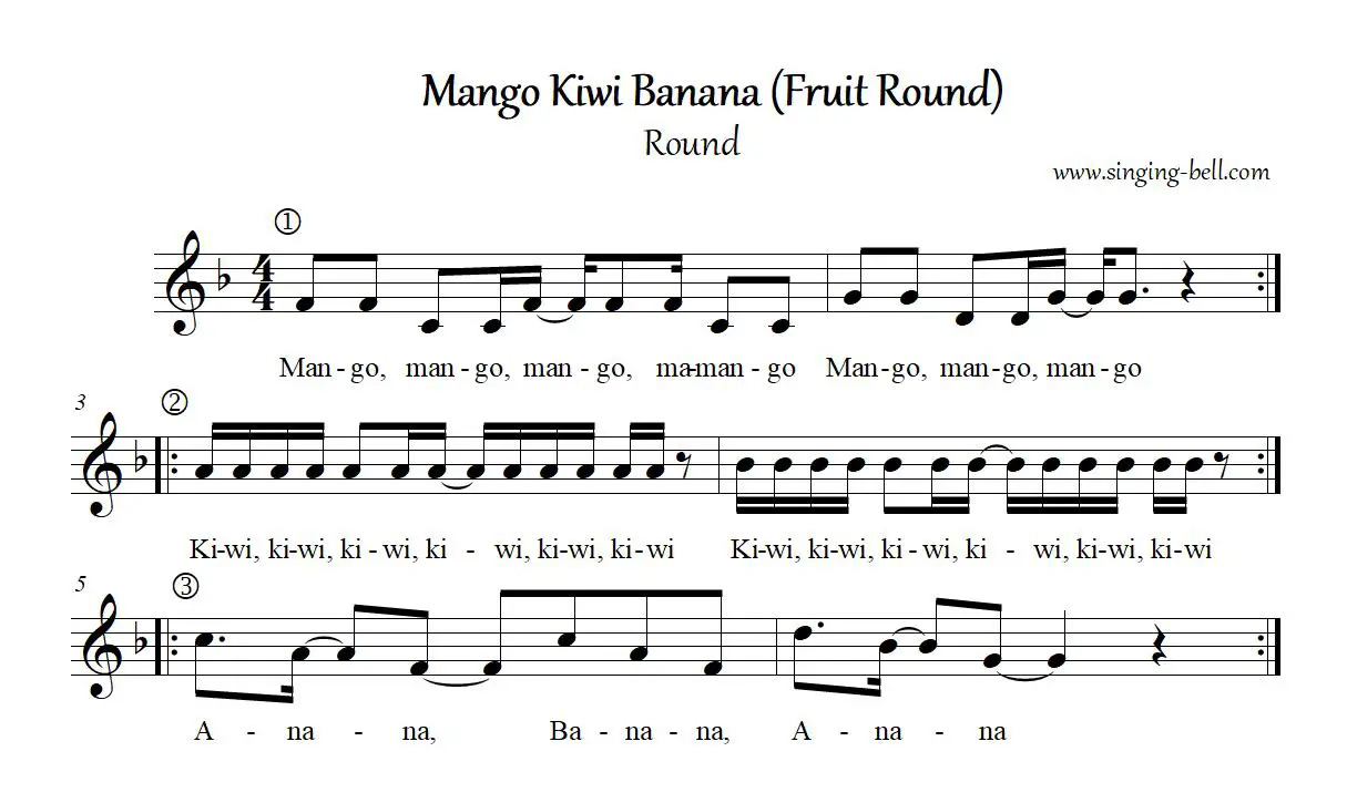 In children’s music education today, playful rounds like Mango Kiwi Banana are used to combine humor and learning. The nonsensical but catchy fruit names allow kids to focus on timing and harmony without being distracted by complex texts.